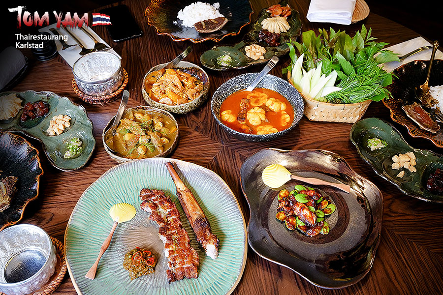 Tigerräkor med kokosmjölk, champinjoner, citrongräs, lök och färska kryddor. Serveras med ris. (mediumstark)