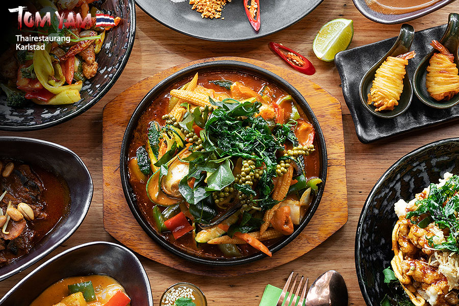 Gryta med panaeng curry, kokosmjölk, ärtor, bambuskott, thaibasilika och limeblad.
