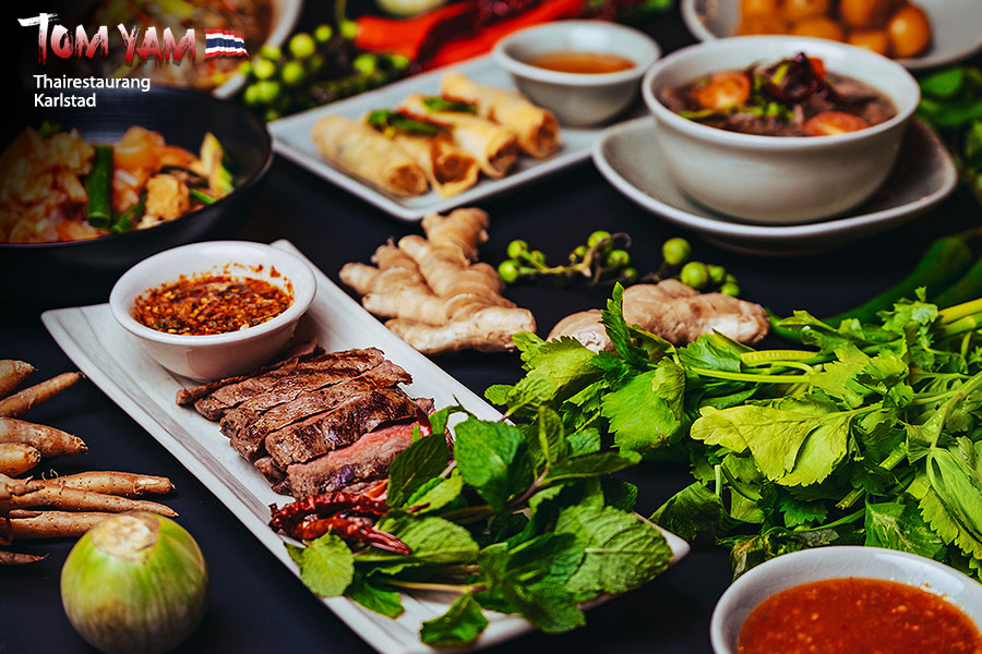 Välj mellan fläsk eller biff. Kryddstark syrlig sallad med rödlök, chili, lime, thaibasilika, purjolök och koriander.