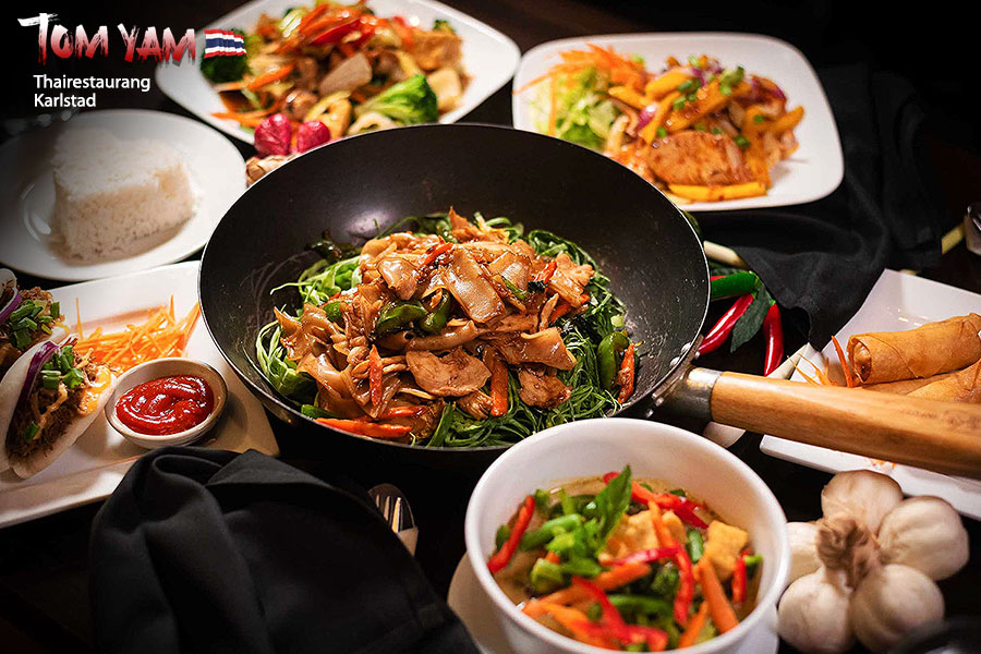 Välj mellan kyckling, fläsk eller tigerräkor. Wok med risnudlar, jordnötter, ägg, purjolök, morötter och vitkål.