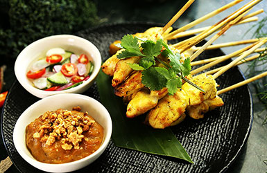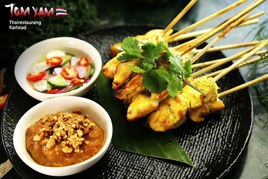 Mixed grill, kyckling, fläsk och tigerräkor. Grillad på spett med gul curry, kokosmjölk och grönsaker. Serveras med jordnötssås, soja och sweetchilisås.