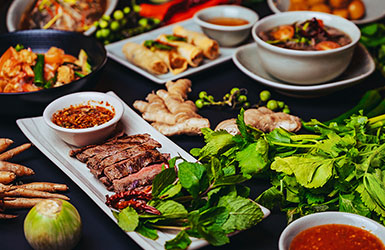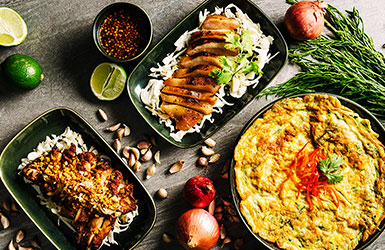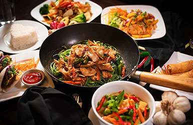 Välj mellan kyckling, biff, lax eller tigerräkor.