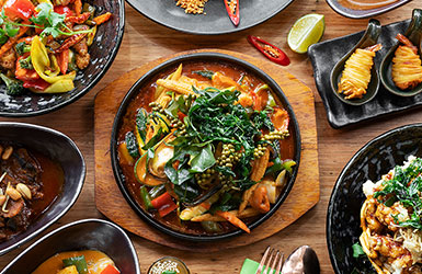 Välj mellan kyckling, biff eller tigerräkor. Kryddstark gryta med röd curry, kokosmjölk, lök, paprika, minimajs, bambuskott, thaibasilika och limeblad. Serveras med ris.